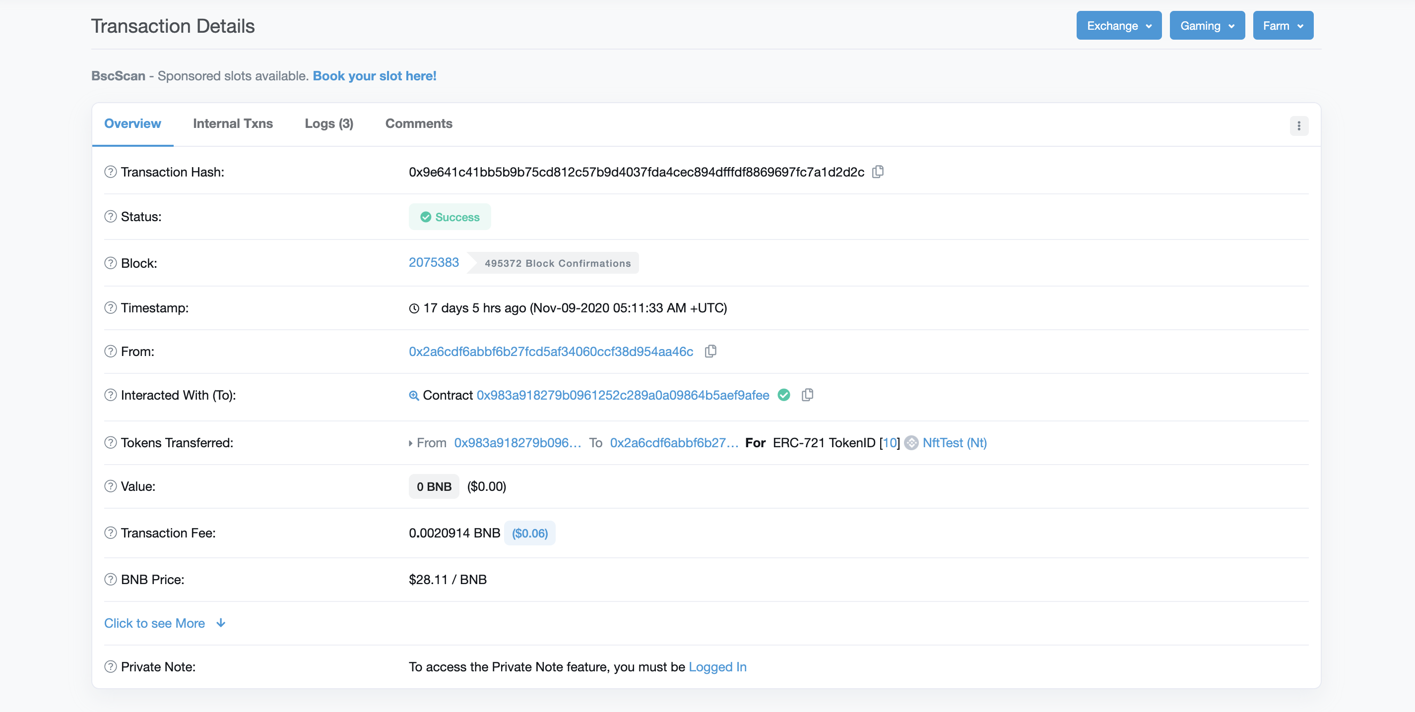 9\.&#x20;BSC's block explorer also supports the display of detailed information of the NFT transfers <https://bscscan.com/tx/0x9e641c41bb5b9b75cd812c57b9d4037fda4cec894dfffdf8869697fc7a1d2d2c>