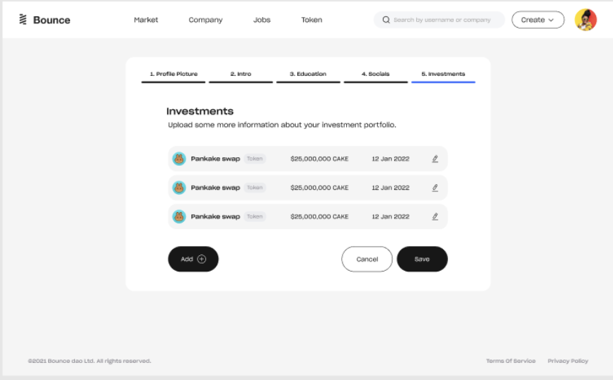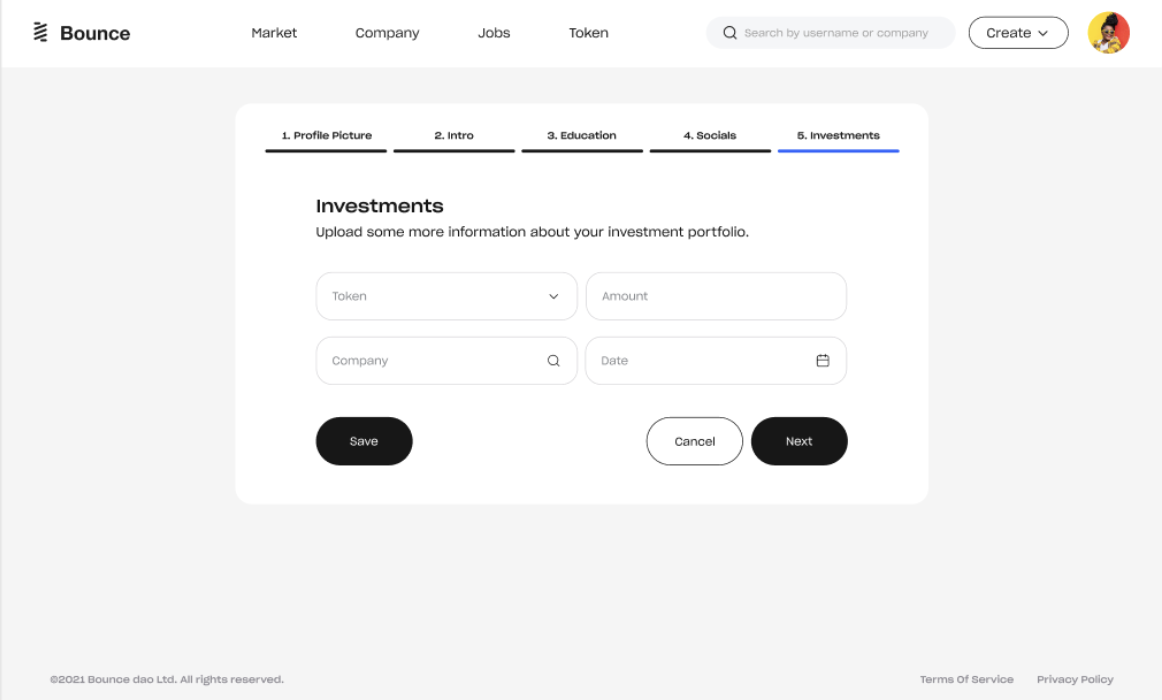 5. You will also be able to provide information about your current and past investments. To do this, simply select the token from the drop-down menu, enter the amount invested, and the date of investment.