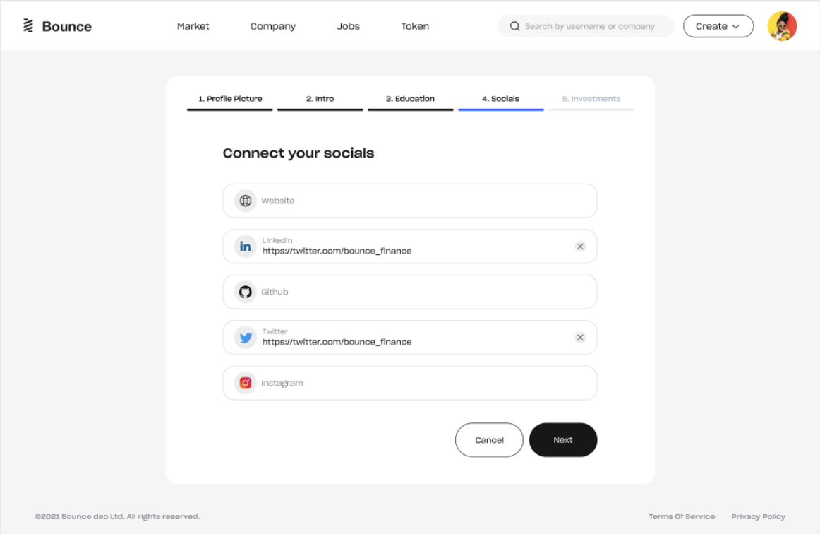 4. You will then have the option to link your social media profiles to your Bounce account. By connecting your accounts on platforms such as GitHub and LinkedIn, you can further demonstrate your expertise and professional background, helping you to stand out among other applicants.